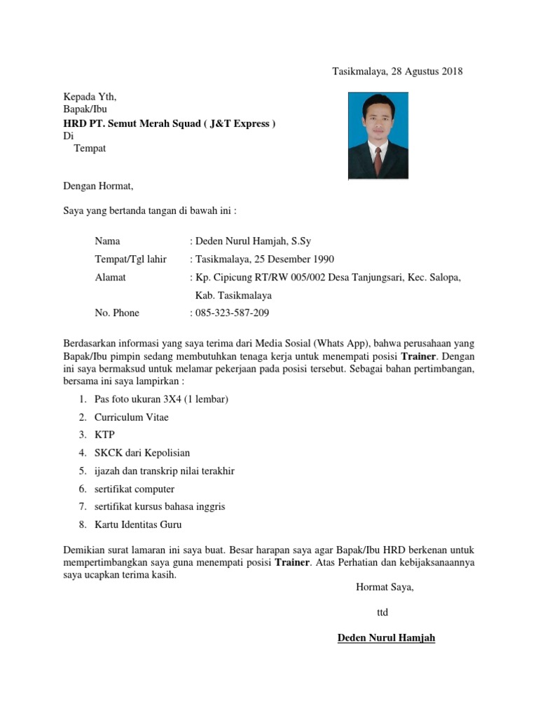 Contoh surat lamaran kerja kurir jt express semua pekerjaan merupakan hal yang mulia karena bekerja guna mencukupi kebutuhan diri sendiri merupakan jalan hidup yang harus dihadapi. Surat lamaran kerja adalah surat yang digunakan untuk melakukan permohonan mendapatkan pekerjaan.