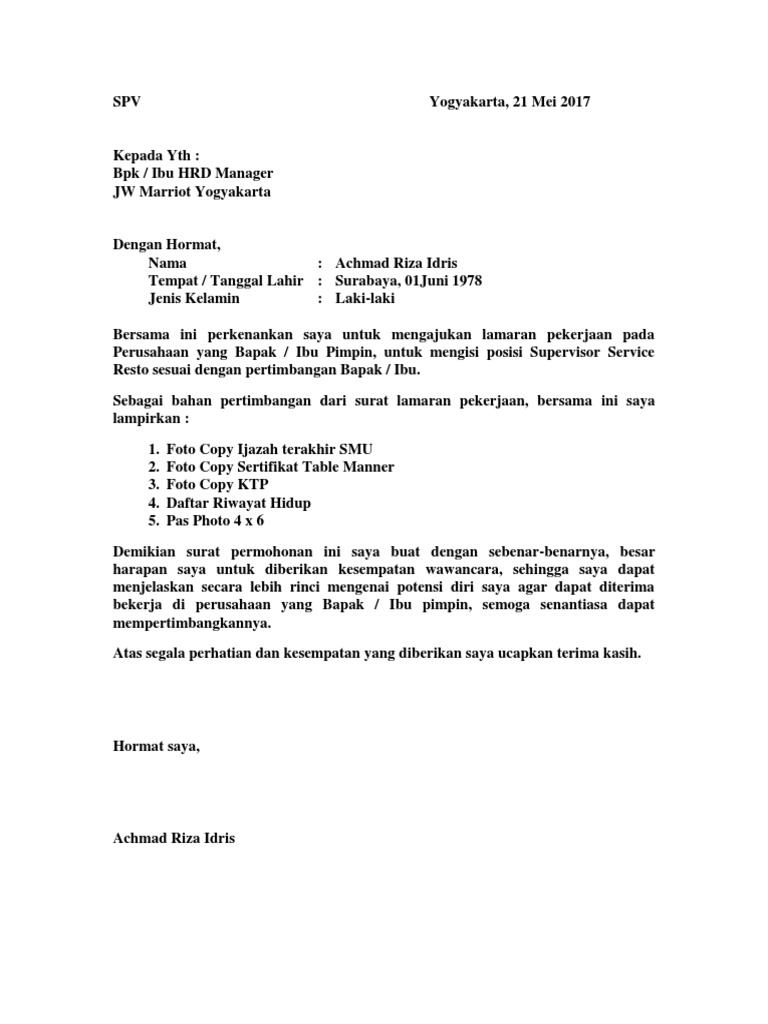 Contoh surat lamaran kerja ke restoran. Namun saya ingatkan terlebih dulu bahwa pada postingan sebelumnya saya sudah share contoh surat lamaran kerja cleaning service apabila anda membutuhkan informasi untuk menulis surat lamaran pekerjaan sebagai cleaning. Tidak ada salahnya jika anda mencoba untuk mengajukan lamaran kerja ke sebuah restoran. Baiklah sebelum lanjut pada topik utama saya mau bicara soal kerja di restoran dan beberapa point penting sebelum sahabat membuat surat lamaran kerja di restoran. Contoh surat lamaran kerja di restoran untuk melamar kerja di restoran harus membuat surat lamaran kerja yang baik dan benar. Restoran baru dari kelas menengah ke bawah sampai menengah ke atas dari yang berkonsep sederhana sampai ke konsep yang mewah. Karena bekerja di restoran tentunya dibagi menjadi beberapa bagian.