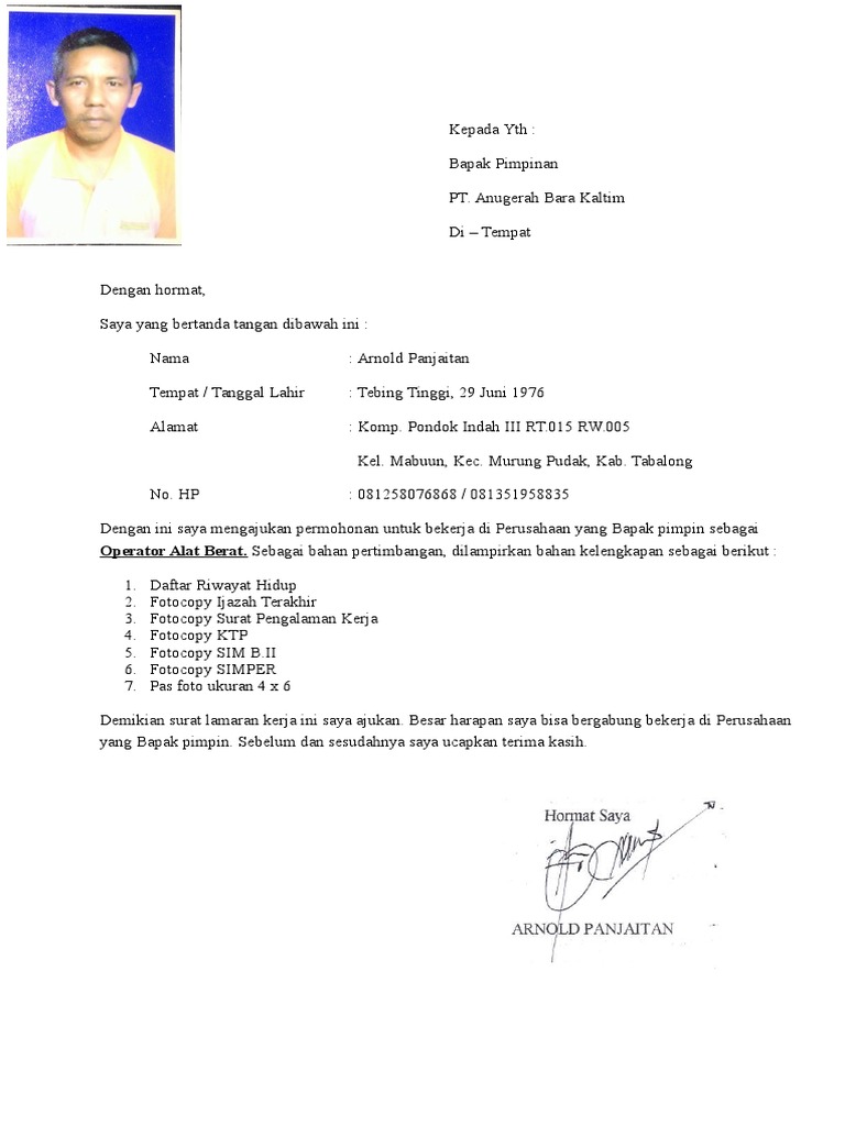 Contoh surat lamaran kerja operator alat berat. Semoga dengan adanya contoh dibawah ini anda dapat membuat surat lamaran yang bagus dan benar sebagaimana contoh pada artikel ini. Tapi saya ingatkan kembali bahwa pada postingan saya sebelumnya saya juga sudah membagikan contoh surat lamaran kerja di kantor notarisapabila anda membutuhkan referensi dalam menulis surat lamaran. Dalam menulis surat permohonan kerja dimanapun bagian yang ingin anda tempati secara garis besar. Surat lamaran kerja operator alat berat untuk soal melamar kerja memang dibutuhkan banyak sekali hal tentang pengalaman tetapi tidak semua membutuhkan pengalaman kerja. Jika anda mencari contoh lamaran kerja operator alat berat maka anda berada di tempat yang tepatblog contohchip memiliki banyak koleksi gambar seperti contoh lamaran kerja operator alat berat gambar ini tersedia dalam format jpg png gif. Contoh surat lamaran kerja operator produksi adalah contoh lamaran pekerjaan terbaru yang akan admin bagikan pada kesempatan ini untuk anda yang ingin melamar kerja sebagai operator produksi.