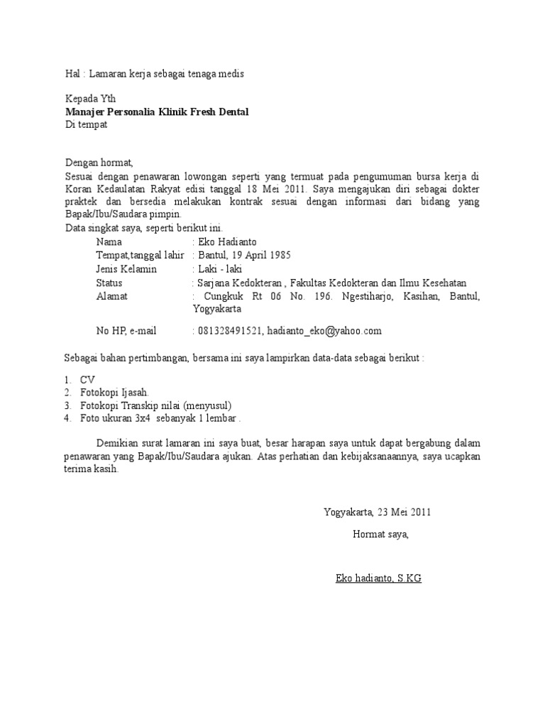 Contoh surat lamaran kerja perawat di klinik. Contoh surat lamaran kerja perawat di berbagai tempat. Contoh surat lamaran kerja sebagai bidan melamar bekerja sebagai perawat atau bidan di puskesmas klinik rumah sakit bisa melalui surat lamaran kerja dan daftar riwayat hidup. Setelah tahu beberapa lowongan perawat terbaru sekarang saatnya menyusun surat lamaran nya. The collection that comprising chosen picture and the best among others. Contoh surat lamaran kerja perawat ke klinik have a graphic associated with the othercontoh surat lamaran kerja perawat ke klinik it also will feature a picture of a kind that may be seen in the gallery of contoh surat lamaran kerja perawat ke klinik. Surat lamaran kerja perawat di klinik kesehatan download.