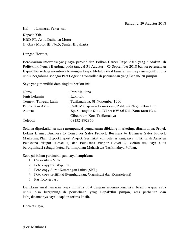 Contoh surat lamaran kerja pt astra daihatsu motor. Contoh surat lamaran kerja adalah suatu hal yang sangat dibutuhkan oleh para orang yang sedang mencari pekerjaan yang sesuai dengan keinginannya. Contoh surat lamaran kerja berikut contoh surat lamaran pekerjaan yang bisa kamu download file dokumennya. Dengan mengetahui kriteria dan kebutuhan rekrutmen yang telah dijelaskan diatas dengan demikian para pencari kerja yang merasa memenuhi persyaratan meliputi pendidikan umur dll dan memang merasa berminat dengan lowongan kerja terbaru pt astra daihatsu motor pada bulan januari 2020 diatas hendaknya secepatnya untuk melengkapi dan menyusun berkas lamaran kerja seperti surat lamaran kerja cv. Contoh surat lamaran kerja umum yang baik benar dan menarik inilah pembahasan lengkap terkait contoh surat lamaran kerja di alfamidi 2019. Berikut data lengkap tentang contoh surat lamaran kerja di dealer motor honda sebagai mekanik. Nah bagi anda yang sekarang sedang mencari pekerjaan untuk bulan januari februari maret april mei juni juli agustus september oktober november dan desember disini adalah tempat yang tepat untuk mengetahui.