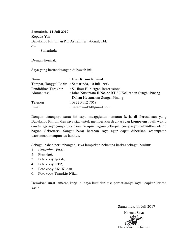 Surat lamaran kerja astra adalah surat yang dibuat oleh seseorang untuk mengajukan lamaran pekerjaan dalam rangka mengisi salah satu posisi yang sedang dibutuhkan oleh perusahaan pt. Surat lamaran kerja astra secara umum mencantumkan informasi terkait profil singkat pelamar beserta riwayat yang dimilikinya mulai dari. Contoh surat lamaran kerja astra honda motor contoh surat lowongan kerja di astra group salah satu tempat kerja yang selalu menjadi favorit dan incaran banyak orang setiap tahunnya adalah pt. Kepada yth hrd pt sumber alfaria trijaya. Contoh surat lamaran kerja di perusahaan seringkali dicari oleh para pencari kerja yang ingin mengajukan lamaran pekerjaan di perusahaan perusahaan yang ada di indonesia. Nah jika anda juga berencana melamar pekerjaan di perusahaan maka contoh surat lamaran kerja di persuahaan yang akan saya bagikan di bawah ini patut anda simak.