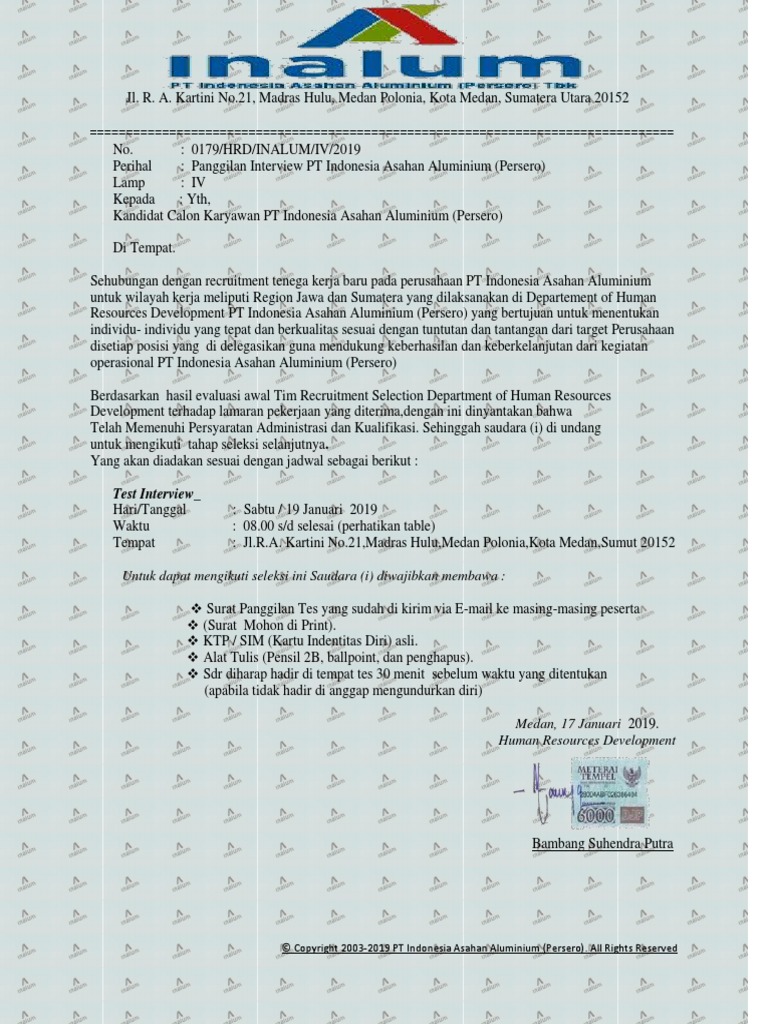 Medan 13 juni 2019. Kepada yth hrd pt sumber alfaria trijaya. Lowongan kerja pt indonesia asahan aluminium terbaru sahabat pencaker pada kesempatan kali ini saya kembali akan berbagi informasi seputar lowongan kerja perusahaan bumn terbaru. Nah jika anda juga berencana melamar pekerjaan di perusahaan maka contoh surat lamaran kerja di persuahaan yang akan saya bagikan di bawah ini patut anda simak. Seperti yang kita ketahui cara pt pindad adalah pt yang bergerak dalam bidang pembuatan produk militer. Informasi yang anda cari adalah contoh surat lamaran pt inalumdibawah ini telah kami sajikan informasi lowongan kerja lulusan sma smk d3 s1 s2 semua jurusan lowongan bank bumn cpns dan swasta lainnya berdasarkan keterkaitan artikel ataupun keterkaitan iklan yang benar benar sesuai dengan kata kunci.