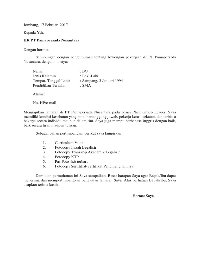 Contoh surat lamaran kerja pt pama. Tempat dan tanggal pembuatan surat nomor surat lampiran hal dan banyak lagi lainnya yang dibahas di artikel ini. Tidak peduli apa tingkat pendidikannya atau pun keahlian apa yang dimiliki seseorang tersebut. Bagi anda yang sedang mencari referensi surat melamar kerja lanjutkanlah membaca artikel ini hingga akhir. Sistematika surat lamaran pekerjaan meliputi. Pama persada nusantara di jakarta dengan hormat berdasarka informasi yang saya terima dari bkk media karya smk cokroaminoto 2 banjarnegara tentang lowongan pekerjaan di pt pama persada nusantara. Medan 13 juni 2019.
