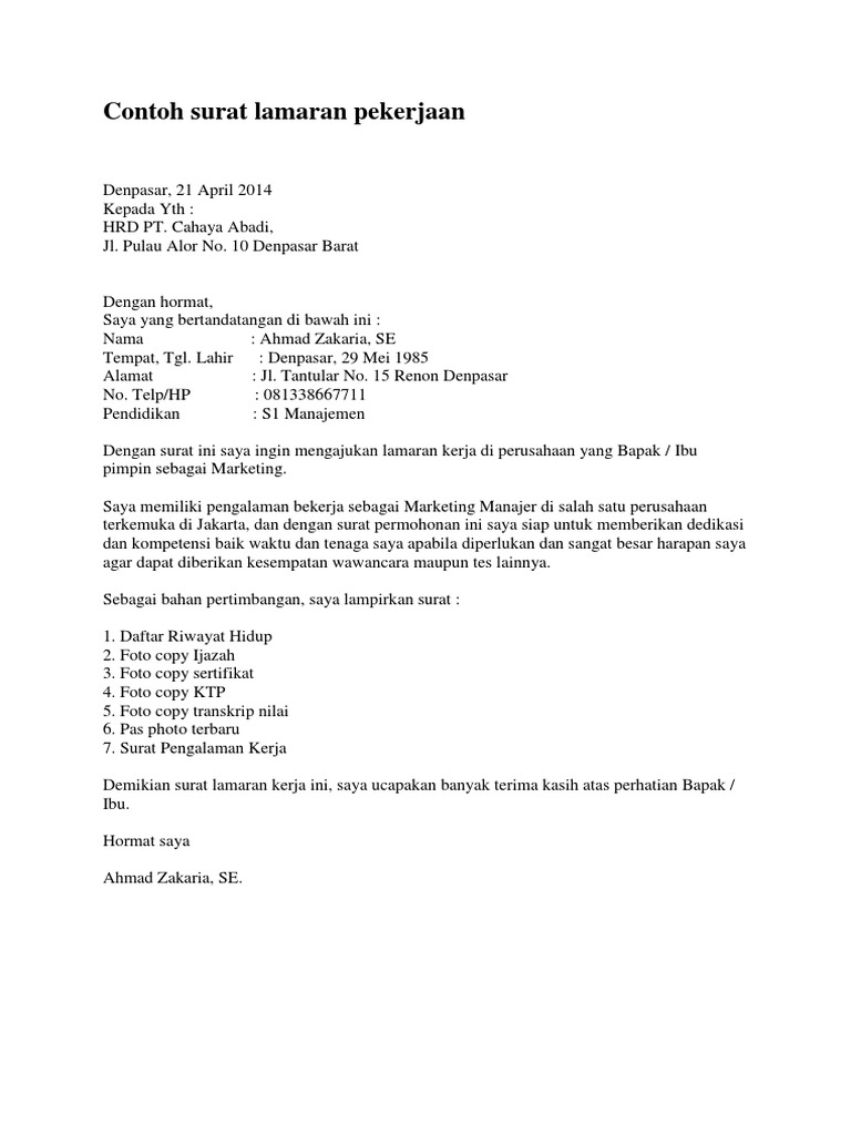 Surat lamaran kerja adalah sebuat surat yang dibuat untuk keperluan permohonan bergabung atau bekerja di sebuah perusahaan dengan posisi atau jabatan sesusai dengan apa yang dibutuhkan oleh perusahan penyedia lowongan kerja. 3surat lamaran kerja hendaknya ditulis secara manual dan memang anda yang membuatnya 4lengkapi dengan data data yang dibutuhkan oleh perusahaan tempat anda melamar kerja 5lampirkan surat pendukung lainnya seperti sertifikat pengalaman kerja contoh surat lamaran kerja bali 20 maret 2018 kepada yth.