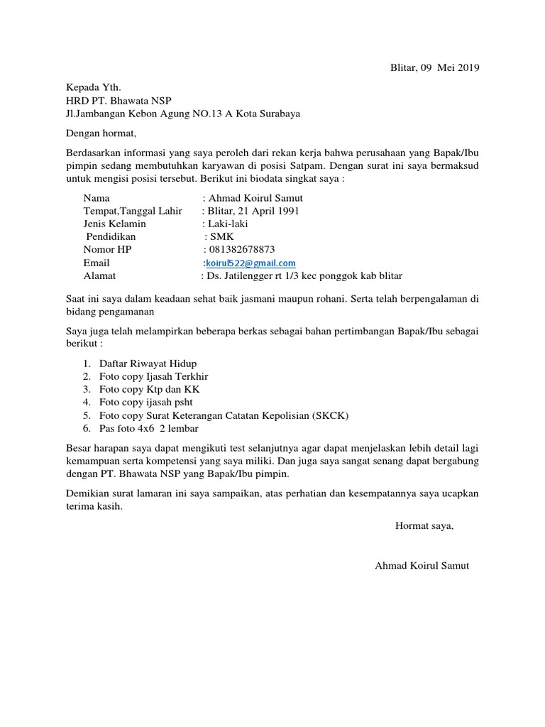 Contoh surat lamaran kerja untuk security. Demikianlah salah satu contoh surat lamaran kerja satpam atau security yang baik dan benar. Contoh surat lamaran kerja security untuk mall. Tugas anda hanya memilih mana posisi yang pas dan sesuai dengan passion anda untuk anda lamar. Contoh surat lamaran untuk jadi security demikianlah salah satu contoh surat lamaran kerja satpam atau security yang baik dan benar. Tugas anda hanya memilih mana posisi yang pas dan sesuai dengan passion anda untuk anda lamar. Dengan hormat bersamaan dengan surat ini saya bermaksud untuk melamar lowongan pekerjaan sebagai security pada pt.