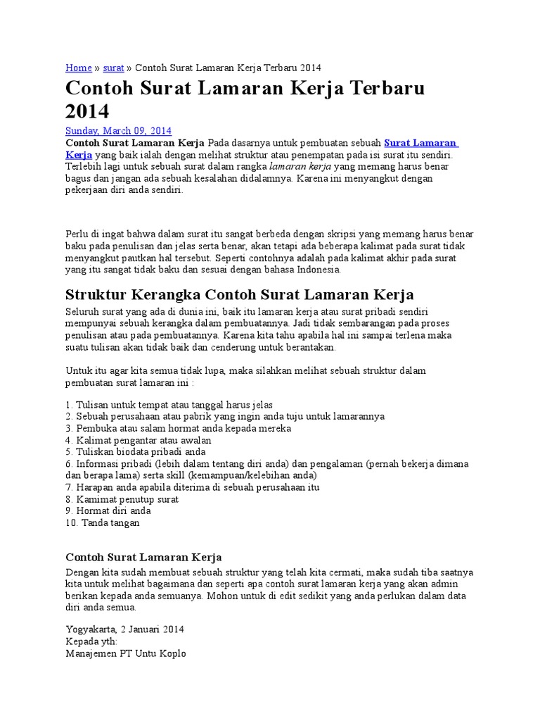 Mungkin terdapat jutaan artikel di internet yang menyediakan panduan bagaimana cara membuat surat lamaran pekerjaan yang disertai contoh surat lamaran pekerjaan baik itu surat lamaran kerja untuk melamar ke perusahaan maupun surat lamaran pekerjaan. Contoh surat lamaran kerja berikut contoh surat lamaran pekerjaan yang bisa kamu download file dokumennya. Format dari contoh surat lamaran kerja sangat mempengaruhi diterima tidaknya kita ketika sedang melamar di perusahaan. Tulislah hobi yang bersangkutan dengan pekerjaan yang sedang dilamar. Surat lamaran kerja dibutuhkan guna melamar pekerjaan baru untuk kamu yang baru lulus kuliah pindah kerja cari suasana baru maupun fresh graduate. Contoh surat lamaran kerja membuat surat lamaran kerja tidak boleh asal dalam membuatnya membutuhkan acuan sebagai referensi contoh surat lamaran kerja ini adalah salah satu bahan yang bisa dijadikan acuan dalam membuat surat lamaran pekerjaan.