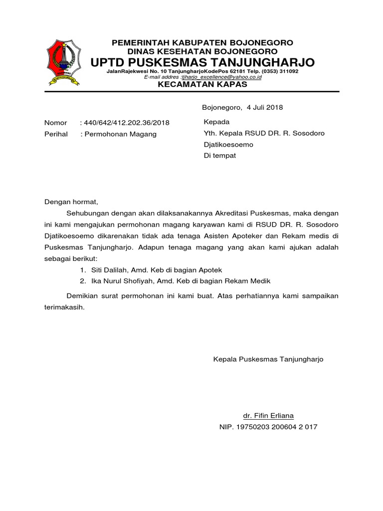 Bahwa surat lamaran pekerjaan ini dibuat sebagai salah satu persyaratan resmi bahwa anda telah melamar suatu pekerjaan pada instansi atau perusahaan tertentu. Surat lamaran kerja di puskesmas contoh sederhana surat lamaran kerja untuk puskesmas tribun 17 contoh surat lamaran kerja yang membuat kamu diterima kerja surat permohonan untuk diterima menjadi tenaga pengabdi contoh surat lamaran kerja bidan paling lengkap dengan file word 10. Contoh surat lamaran magang bidan praktek. Khususnya bagi anda yang ingin melamar kerja sebagai perawat di rumah sakit puskesmas klinik baik bagi anda yang sudah berpengalaman kerja sebagai perawat sebelumnya ataupun bagi anda lulusan baru atau fresh graduate. Gambar contoh surat magang perawat di puskesmas terbaru 2019. Contoh surat magang perawat di puskesmas have an image from the othercontoh surat magang perawat di puskesmas in addition it will include a picture of a kind that could be seen in the gallery of contoh surat magang perawat di puskesmas.