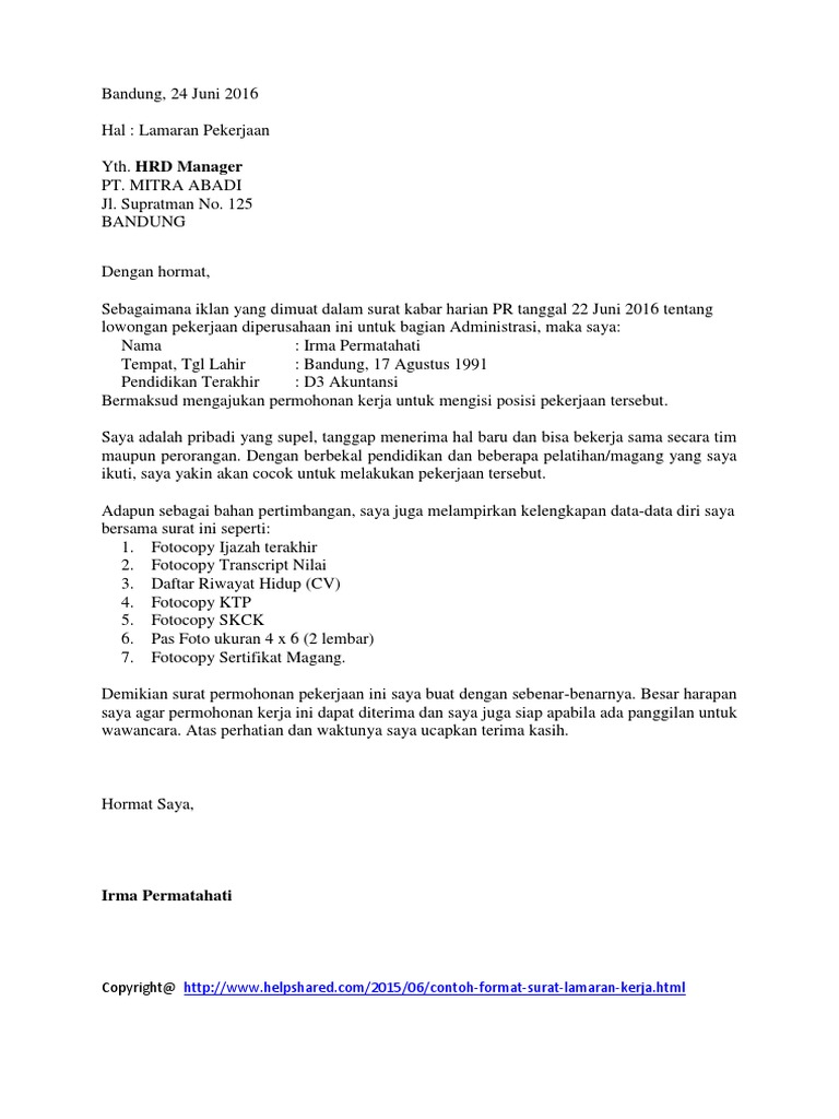 Bagi mahasiswa yang sudah menginjak semester 6 atau lebih pasti akan diminta untuk melakukan magang kerja selama beberapa bulan. Surat lamaran pekerjaan dapat juga didefinisikan sebagai surat dari calon karyawan kepada calon majiakan yang berisi permintaan agar calon karyawan diberi pekerjaan. Jalan kebon agung 3 sleman yogyakarta perguruan tinggi. Demikian penjelasan seputar contoh portofolio lamaran kerja yang memang harus menggunakan bahasa resmi seperti contoh surat resmi yang telah kami jelaskan sebelumnya. Contoh surat lamaran pekerjaan pribadi. Contoh surat permohonan magang pribadi.