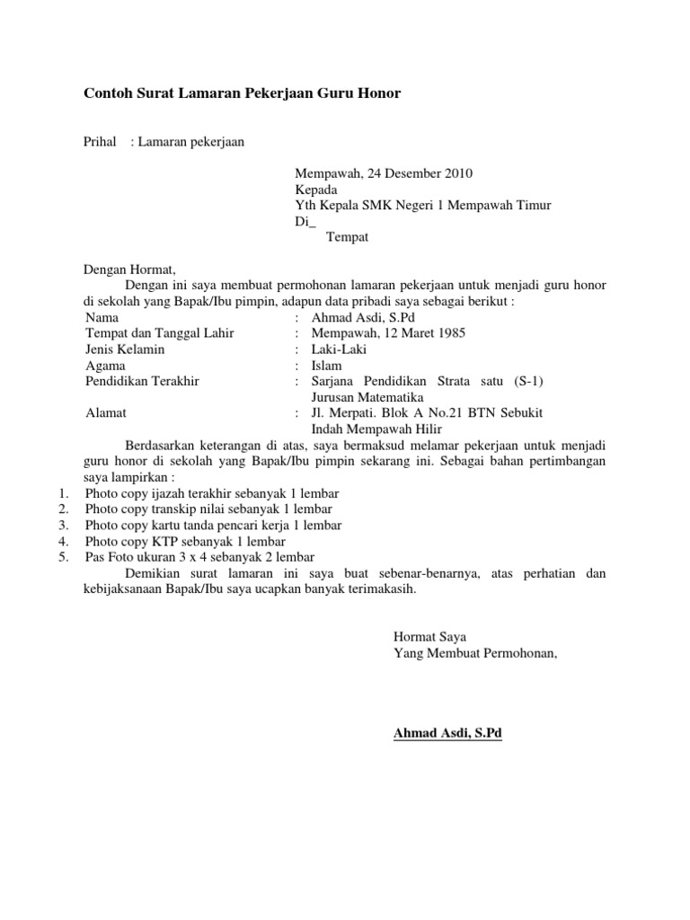 Saat membuat surat lamaran kerja guru pergunakan bahasa yang santun dan formal serta pilihlah kosakata yang sesuai dengan eyd. Contoh surat lamaran kerja guru pilihan menjadi guru bagi sebagian orang terutama bagi mereka lulusan perguruan tinggi tentulah menjadi idaman dan kebanggaan tersendiri. Namun kesulitan mencari pekerjaan sekarang ini seringkali menjadi momok yang menakutkan bagi banyak orang. Contoh surat lamaran kerja guru bimbel bimbingan belajar atau bimbel nampaknya sudah sangat populer sekali di indonesia terbukti saat ini sudah ada banyak sekali ratusan lembaga bimbingan belajar di indonesia terutama di kota kota besar seperti jakarta jogja surabaya dan juga di kota kota lainnya hal ini tentu sangat berdampak positif sebab selain membantu mencerdaskan bangsa juga. Akan tetapi karena tujuan tempat bekerja anda. Perbedaannya pada surat lamaran kerja guru terdapat pada posisi yang kamu lamar tentu saja langsung tertuju pada posisi guru atau pengajar.