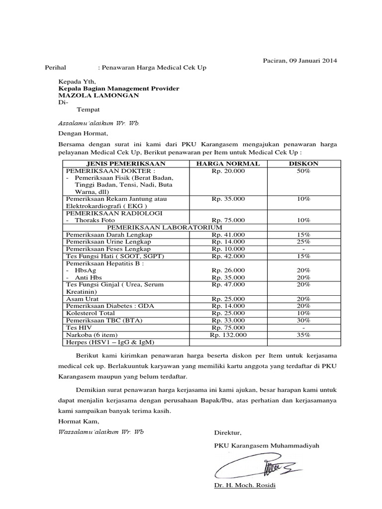 12013 borang permohonan pemeriksaan perubatan untuk pelantikan ke dalam perkhidmatan awam pemohon hendaklah mengisi maklumat di bahagian a b dan dan menyerahkan borang ini c berserta surat tawaran pelantikan kepada pengamal perubatan berdaftar sebelum pemeriksaan perubatan dibuat. 11970 yang menyatakan bahwa medical check up dilakukan setelah karyawan bekerja selama 1 satu tahun dan medical check up dilakukan setiap tahun. Contoh surat penawaran kerjasama medical check up adalah gambar contoh penawaran berdefinisi tinggi dan memiliki ukuran 768x1024. Anda dapat melihat dengan jelas contoh surat penawaran kerjasama medical check up menggunakan desktop anda tablet android atau iphone dan perangkat smartphone lainnya secara gratis. Pendaftaran dengan membawa surat pengantar medical check up yang. Apakah ada dasar hukum yang mengatakan karyawan baru masuk harus langsung di medical check up dan biaya medical check up tersebut harus berasal dari perusahaan.