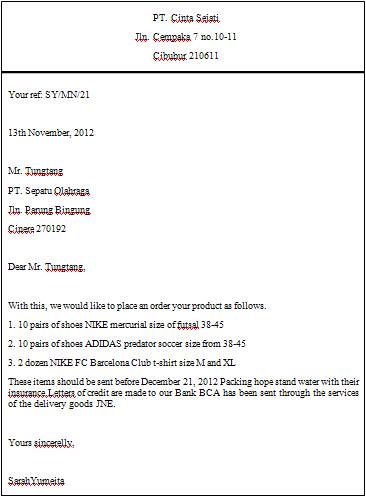 Order letterplacing order is a document or letter that confirms the details of a purchase of goods or services from one party to another. Kepala surat header tercantum alamat.
