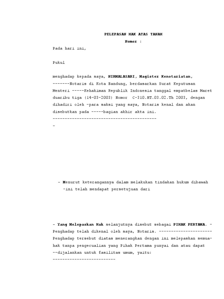Pada hari ini minggu tanggal tujuh belas bulan oktober dua ribu sepuluh kami yang bertanda tangan di bawah ini masing masing. Surat pernyataan pelepasan hak tanah ini dibuat rangkap 5 lima dimana 1 satu lembar asli masing masing mempunyai kekuatan hukum yang sama i. Akta pelepasan hak oleh notaris pelepasan hak adalah perbuatan hukum melepaskan hubungan hukum antara subyek hak atas tanah dengan tanah yang di haki dimilikinya kewenangan notaris dalam membuat akta di bidang pertanahan sangat sempit ruang lingkupnya.