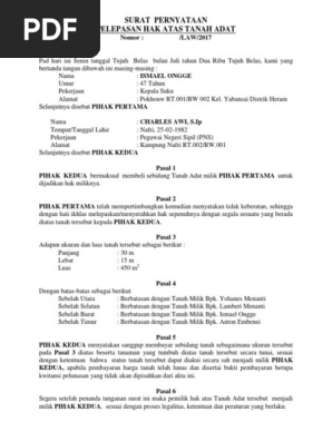 Yang membedakan hanya objeknya yaitu tanah. Bagi teman teman yang ingin membagi warisan berupa sebidang tanah berikut ini saya lampirkan contoh surat untuk penyerahan warisan sebidang tanah yang diketahui oleh seluruh ahli waris. Contoh surat jual beli tanah. Baik menjual maupun membeli. Contoh perjanjian pelepasan hak tanah adat perjanjian pelepasan hak pada hari ini rabu tanggal satu bulan dua tahun dua ribu sebelas 01 02 2012 bertempat di surabaya telah terjadi perjanjian pelepasan hak oleh dan antara. Widodo huta iii nagori karang.