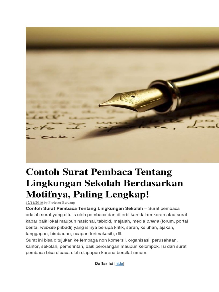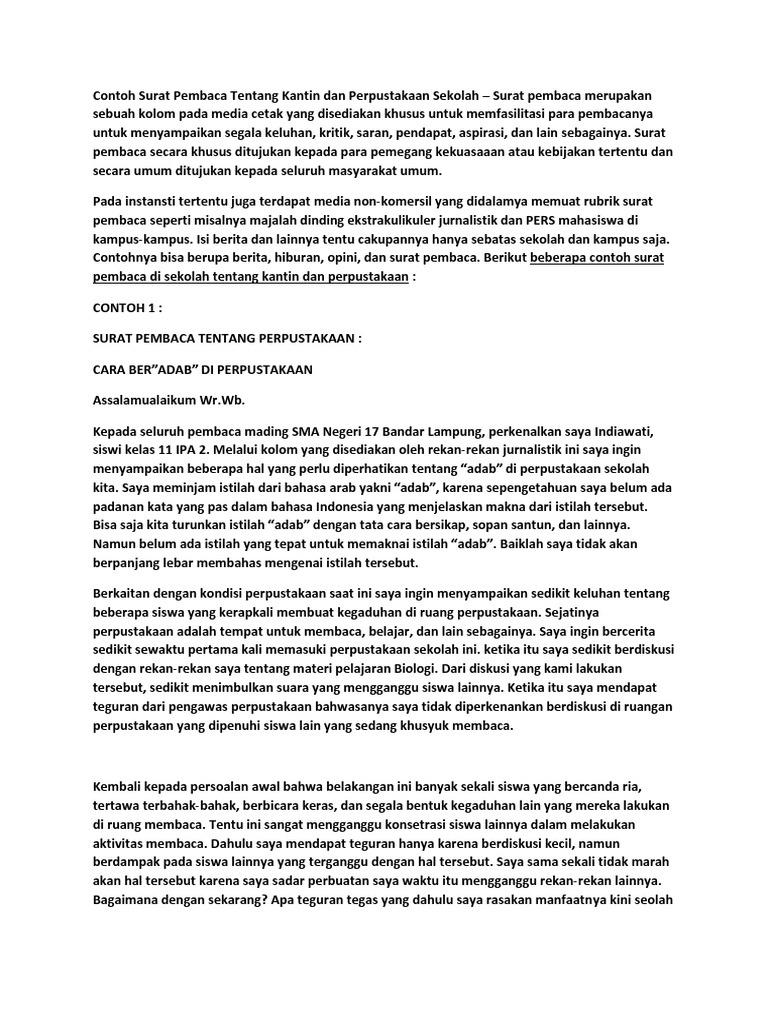 Contoh surat pembaca tentang kebersihan sekolah. Pengertian dan contoh surat pembaca tentang lingkungan sekolah serta cara membuatnya pengertian surat pembaca surat pembaca adalah surat yang ditulis oleh pembaca yang dimuat dalam surat kabarkoran majalah yang berisi tanggapan saran keluhan ajakan imbauan ucapan terima kasih dan lain lain. Contoh surat pembaca tentang kantin dan perpustakaan sekolah surat pembaca merupakan sebuah kolom pada media cetak yang disediakan khusus untuk memfasilitasi para pembacanya untuk menyampaikan segala keluhan kritik saran pendapat aspirasi dan lain sebagainya. Contoh surat pembaca tentang fasilitas kebersihan sekolah untuk menjaga kebersihan sekolah maka tentu anda harus memiliki fasilitas kebersihan mulai dari sapu tong sampah dan lainnya. Surat pembaca ialah surat yang ditulis oleh seorang pembaca dari surat kabar tertentu yang di dalamnya berisikan saran pendapat opini kritik himbauan informasi dan lain lain yang ditujukan kepada khalayak ramai. Contoh surat pembaca tentang lingkungan sekolah surat pembaca adalah surat yang ditulis oleh pembaca dan diterbitkan dalam koran atau surat kabar baik lokal maupun nasional tabloid majalah media online forum portal berita website pribadi yang isinya berupa kritik saran keluhan ajakan tanggapan himbauan ucapan terimakasih dll. Contoh surat pembaca tentang kebersihan lingkungan sekolah surat pembaca merupakan sebuah kolom pada media cetak yang disediakan khusus untuk memfasilitasi para pembaca.