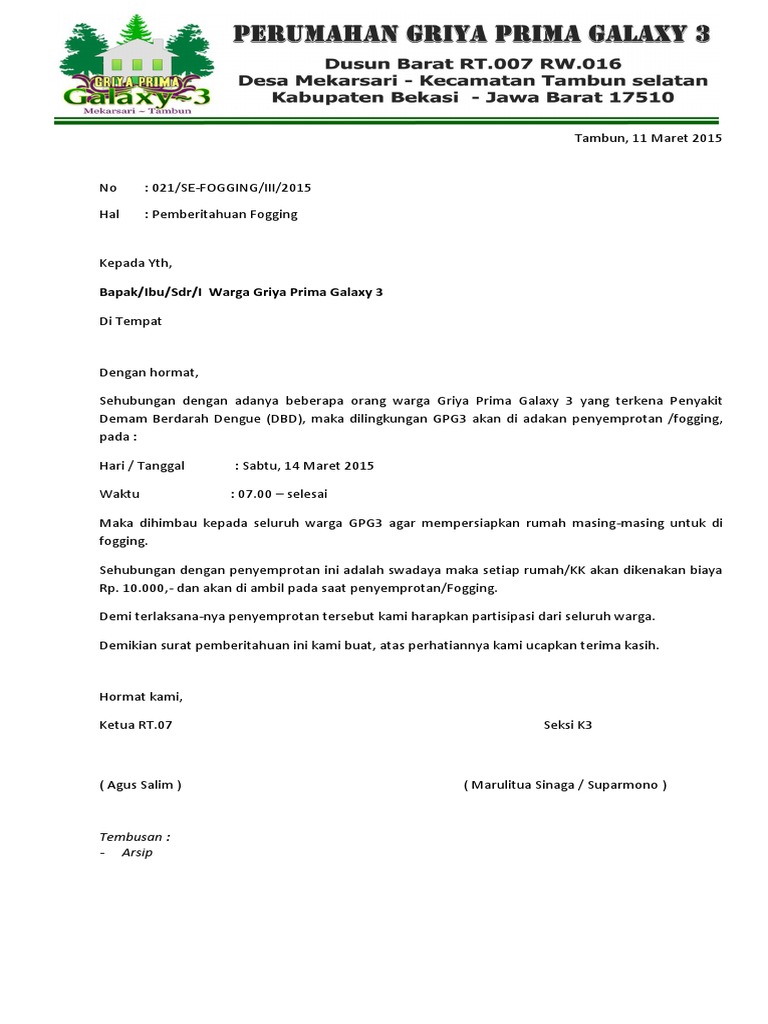 Pemberitahuan foggingpengasapan kepada yth. Jika benar kamu sudah tepat berada di blog ini. 60000 merupakan suatu kebutuhan untuk meningkatkan keamanan dan fasilitas perumahan. Pemberitahuan pengasapan fogging di palm residence. Ok deh lansung saja ini artikelnya. Contoh surat pemberitahuan fogging have some pictures that related one another.