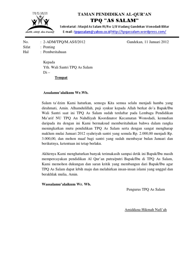 Surat Pemberitahuan Spp Dan Biaya Kos Pondok Pesantren