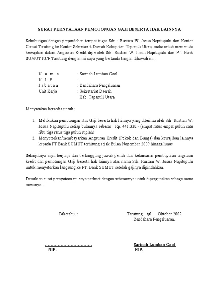 Admin blog contoh seputar surat 2019 juga mengumpulkan gambar gambar lainnya terkait contoh surat pernyataan pemotongan gaji karyawan dibawah ini. Slip gaji yang baik berisi rincian atau detail dari gaji karyawan tersebut. Surat pemberitahuan ini disampaikan kepada karyawan supaya bisa. Berikut ini merupakan sebuah surat keterangan karyawan untuk mendaftarkan diri ke bpjs kesehatan dengan cara pemotongan gaji bulanan. Inilah pembahasan selengkapnya mengenai contoh surat pernyataan pemotongan gaji karyawan. Contoh surat permohonan pemotongan gaji kerjamini blogspot 2013 09 contoh surat kuasa potong gaji html02 09 2013 contoh surat kuasa potong gaji penjaga pena 2 29 pm kantor tugas surat kuasa subtitusi pemotongan tabungan gaji contoh surat.
