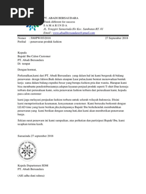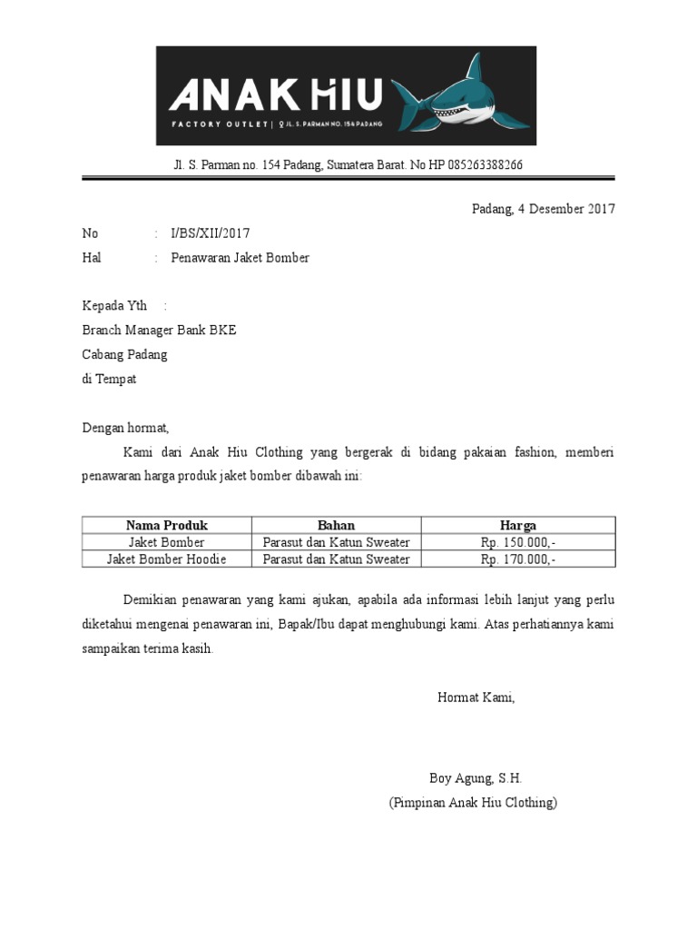 Contoh surat penawaran produk fashion. Adapun surat yang dipergunakan oleh suatu perusahaan atau instansi merupakan jenis jenis surat resmi dimana penulisannya harus sesuai dengan kaidah kaidah penulisan surat resmi dan penggunaan bahasa yang baik serta sesuai dengan. Veteran no32 padang sumatera selatan padang 19 januari 2011 tlp. Namun terutama di sektor pakaian tentu pasarnya sangat bear dan menggiurkan. Jangan terlena karena ada banyak sekali produsen pakaian yang siap berebut pelanggan. Contoh surat penawaran menjadi seorang pengusaha atau bisnisman pasti akan mengenal salah satu jenis surat resmi ini.