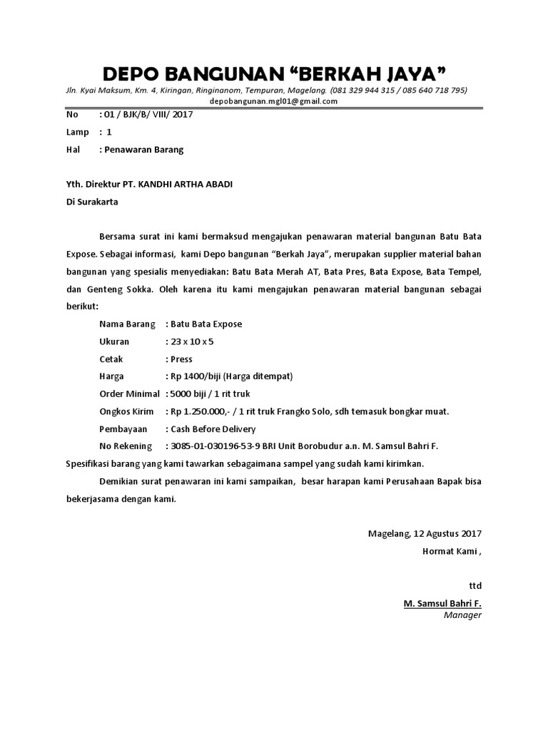 Contoh surat penawaran harga barang material. Penawaran barang kerja sama dan jasa akan jadi lebih baik apabila memakai surat penawaran. Download contoh surat penawaran harga barangproduk. Penawaran barang kerja sama dan jasa akan jadi lebih baik apabila memakai surat penawaran. Sehingga dengan begitu calon pembeli jadi tahu berapa harga barang servis pelayanannya persyaratan jual beli dan lain lain. Dalam dunia perdagangan surat penawaran merupakan suatu hal yang penting. Hanya saja pada surat ini posisi kita lah yang bertindak sebagai pengirim surat ke suatu perusahaan dan meminta mereka melakukan penawaran barang yang mereka miliki ke perusahaan kita.