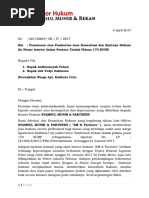 Memberikan pandangan danatau nasehat hukum legal opinion negosiasi dan hal hal lain yang bersifat non litigasi tidak termasuk litigasi. Demikian kami sampaikan penawaran jasa hukum ini apabila bapakmenyetujui syarat syarat dan ketentuan ketentuan proposal jasa hukum sebagaimana tersebut diatas mohon kiranya dapat menandatangani proposal dan surat kuasa ini dan dengan segera dikirimkan kepada kami untuk kami tindak lanjuti. Sebagai in house lawyer maka kami akan bertindak mewakili serta mempertahankan hak hak dan kepentingan hukum dari klien dan menempatkan klien sebagai partners yang harus. Contoh proposal penawaran jasa hukum firma hukum suwito winoto sh rekan sabtu 02 april 2016.