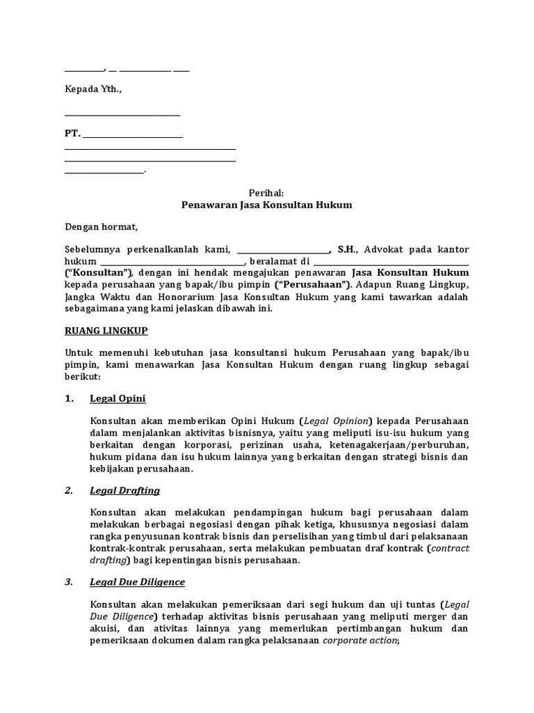 Contoh surat penawaran jasa hukum. Dibayar dimuka oleh klien sejak surat kuasa ditandatangani sedangkan mengenai sucsess fee dapat diatur kemudian dengan surat perjanjian jasa hukum. Demikian penawaran jasa konsultan hukum ini kami ajukan. Advis planning ap dan ijin. Lawyer fee biaya pengacara dalam penanganan hukum yang dibayarkan pada saat penandatanganan surat kuasa. Apabila ada informasi yang perlu diketahui lebih lanjut berkaitan dengan surat penawaran ini maka bapakibu dapat menghubungi kantor kami yang beralamat di atau melalui telepon di nomor atau email ke. Dengan ini kami menawarkan kerjasama di bidang jasa professional hukum dengan cara menjadi mitra atau klien tetap kami yang akan memposisikan kami menjadi in house lawyer bagi perusahaan yang bapakibu pimpin.