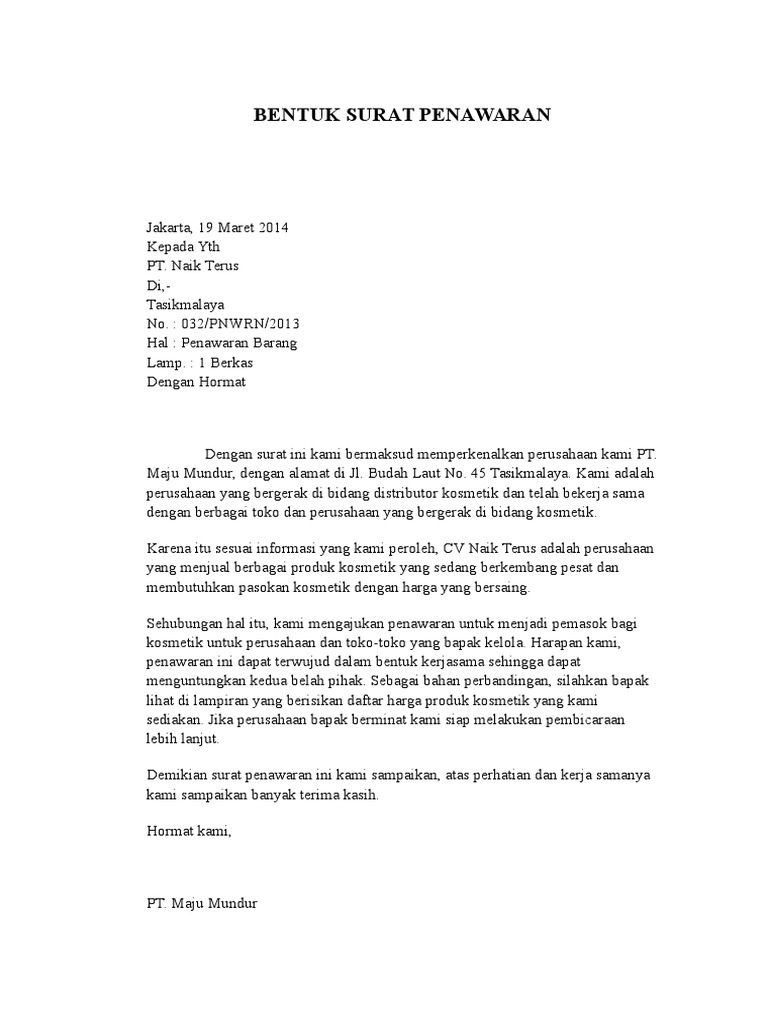 Anda dapat melihat dengan jelas contoh surat penawaran barang kosmetik menggunakan desktop anda tablet android atau iphone dan perangkat smartphone lainnya secara gratis. Seperti penawaran harga rumah penawaran harga komputer dll. 10118 ori indosp2011 kepada yth. Contoh surat penawaran produk. Contoh surat penawaran rumah dan tanah wisbenbae surat penawaran perumahan. Raya buncit indah indonesia 99 blok a jakarta selatan tlp.