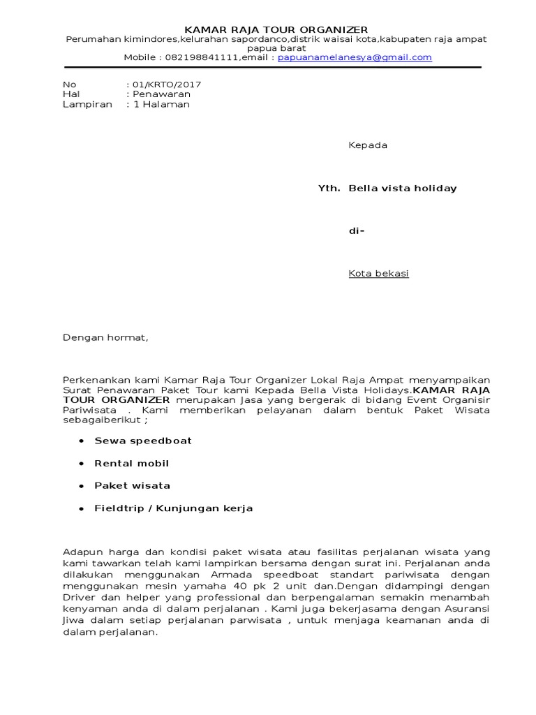 Contoh surat penawaran paket wisata. Contoh surat penawaran semakin hari persaingan bisnis semakin ketat. Academiaedu is a platform for academics to share research papers. Untuk mendapatkanna silahkan anda download contoh surat ini dalam versi word document melalui tombol download di bagian bawah. Raya wangi teh melati km. Indonesia happy travel email. Rasanya bahakan tidak cukup hanya dengan memasang iklan di tempat tempat strategis surat kabar.