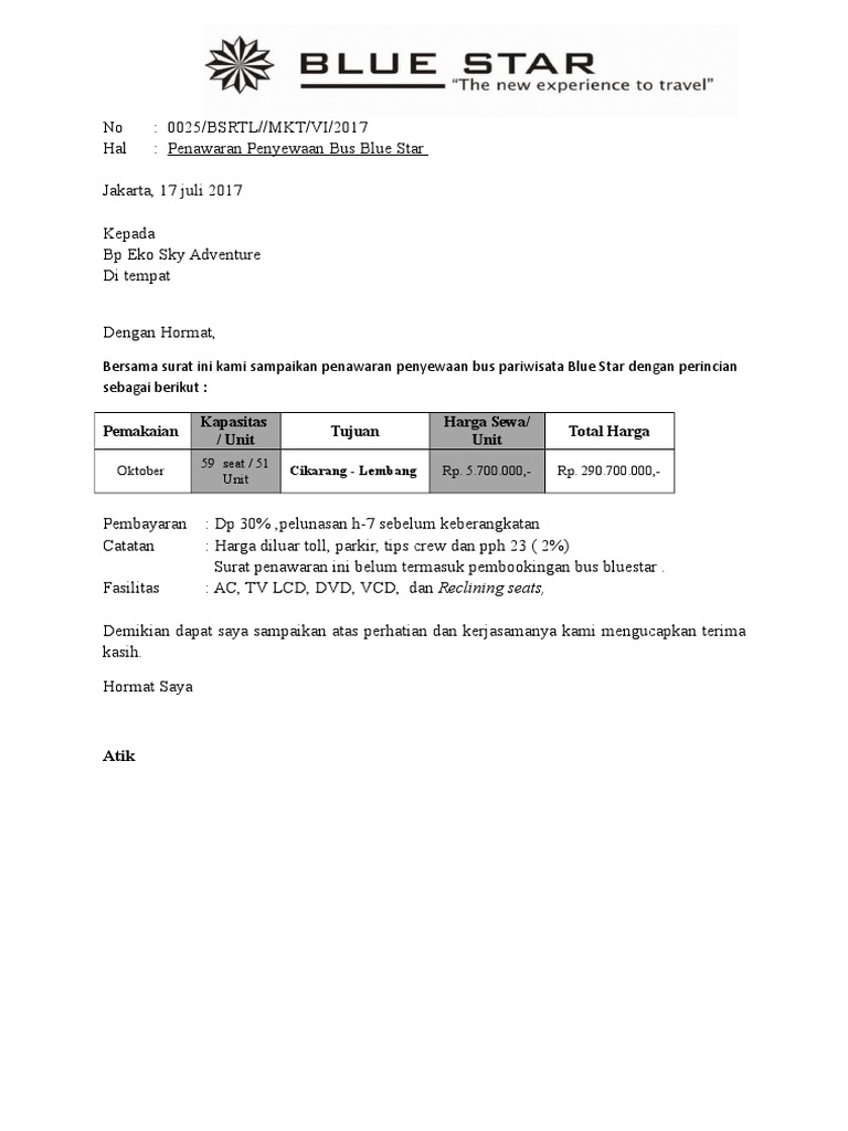 Berkenan memberikansedikit waktu kepada kami untuk dapat melakukan presentasi layanan produk pariwisata yang kami. Contoh surat penawaran harga sewa bus. Contoh surat penawaran menjadi seorang pengusaha atau bisnisman pasti akan mengenal salah satu jenis surat resmi ini. Contoh surat penawaran paket tour format resmi sebagai bahan referensi dalam membuat surat penawaran dengan baik secara profesional. Disamping memiliki pengaruh yang baik untuk membuat jenis usaha kita dapat laris dan laku dipasaran. Surat itu bermaksud meminta kepada penjual agar memberikan penawaran sacara resmi.
