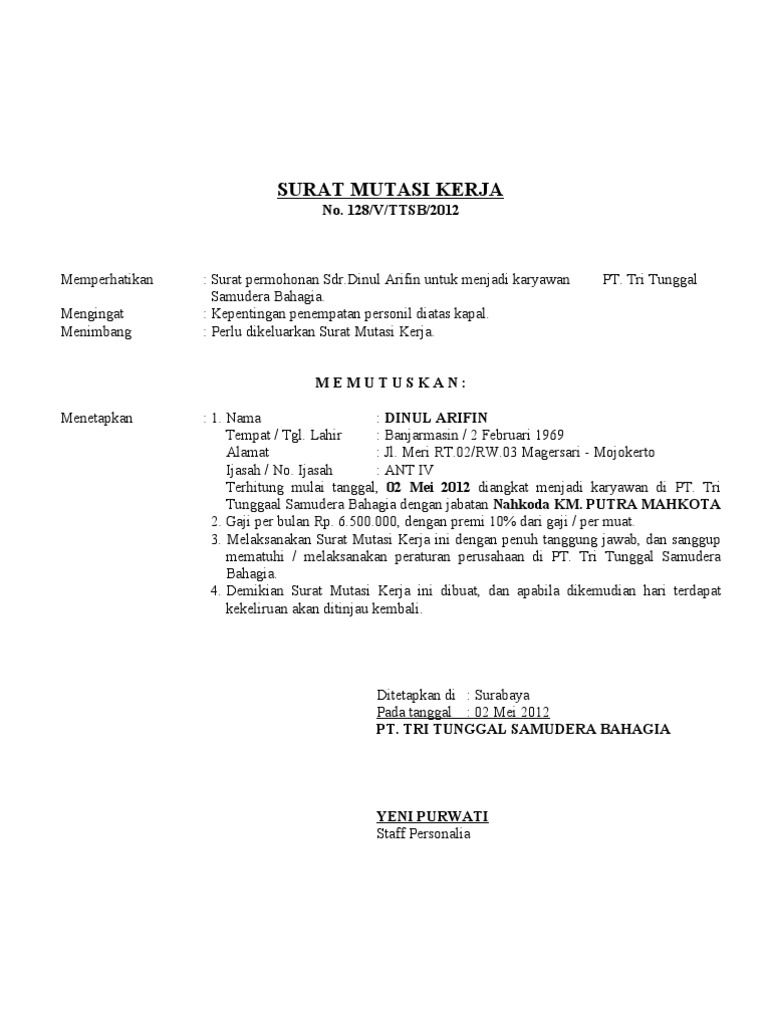 Surat mutasi karyawan adalah surat resmi yang menerangkan pemindahan jabatan seorang karyawan ke posisi jabatan baru atau ke tempat lain dengan level yang sejajar. Saya berharap bapak ibu sekalian dapat pindah ke tempat baru yang diinginkan agar bisa lebih dekat dengan keluarga tercinta. Contoh surat permohonan mutasi kerja pada postingan saya beberapa waktu yang telah lalu saya telah berbagi salah satu. Mutasi karyawan dibuktikan dengan sebuah surat keputusan dari direksi perusahaan yang bersangkutan yang kemudian disebut dengan surat mutasi karyawan. Surat permohonan mutasi instansi pusat hakim jaksa. Mutasi adalah suatu istilah yang digunakan untuk menyebutkan perpindahan tempat bekerja seseorang.