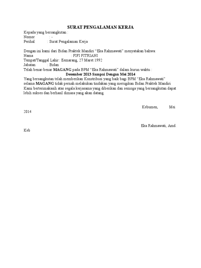 Surat lamaran kerja oktober 17 2019 627 views. 15 contoh surat pengalaman kerja yang baik dan benar bagi orang yang sedang mencari pekerjaan tentu surat pengalaman kerja merupakan salah satu surat yang sangat dibutuhkan. Salah satu fungsi dari surat pengalaman kerja ini misalnya sebagai dokumen penunjang ketika seseorang melamar kerja di perusahaan lain. Dan jika anda ingin bekerja pada rumah sakit yang lebih besar dengan gaji yang lebih menjanjikan tidak ada salahnya untuk anda mencobanya. Surat pengalaman kerja bidan dikeluarkan oleh pihak rumah sakit dengan menunjukkan bukti pernah bekerja sebagai bidan. Surat pengalaman kerja biasanya akan dibuat perusahaan untuk karyawan yang telah mengundurkan diri dari perusahaan tempatnya bekerja.