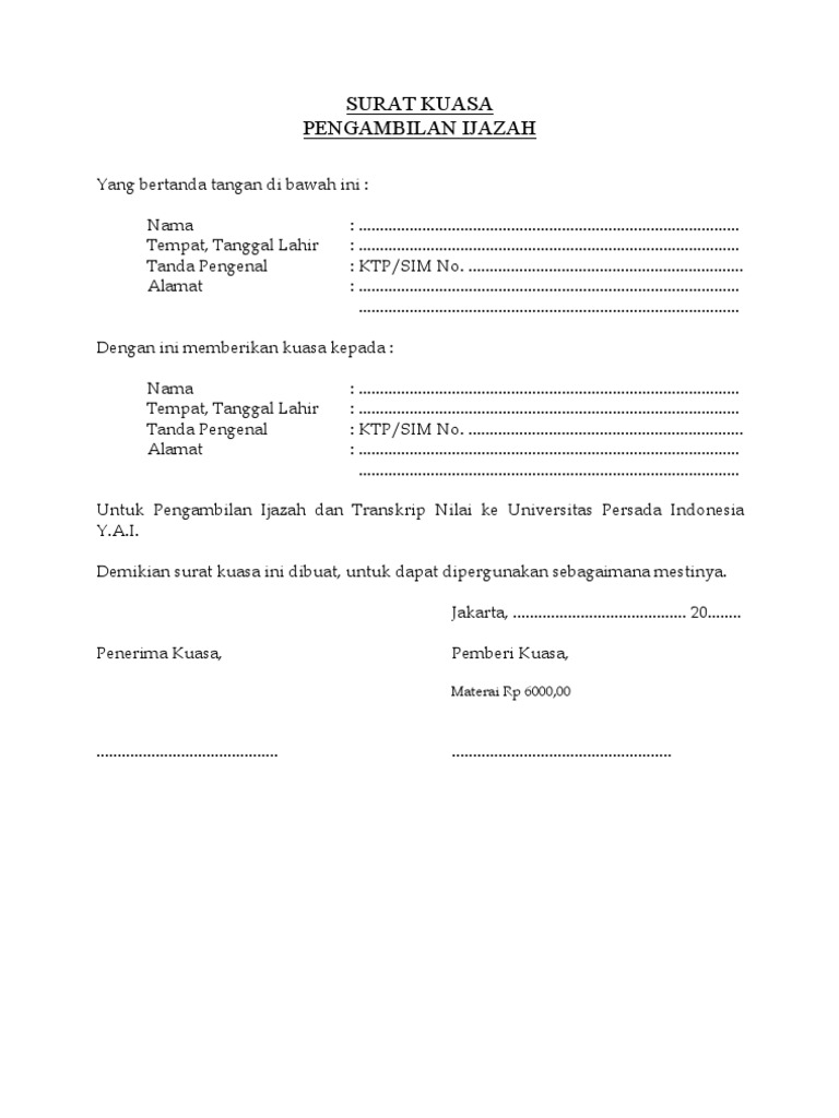11 contoh surat kuasa khusus pengambilan bpkb ijazah pewalian. Contoh surat kuasa pada kesempatan ini saya akan membahas tentang contoh surat kuasa. Contoh surat kuasa pengambilan ijazah. Contoh surat permohonan pengambilan ijazah s1 mahasiswa kuliah karena akan digunakan untuk persyaratan berikut ini adalah contoh suarat tentang contoh surat permohonan pengambilan ijazah s1 mahasiswa kuliah karena akan digunakan untuk persyaratan seperti di bawah ini. Isi diperlukan dan hal hal yang harus diperhatikan di dalam surat kuasa. Walaupun anda menamatkan pendidikan sarjana namun jika tidak memegang ijazah maka.