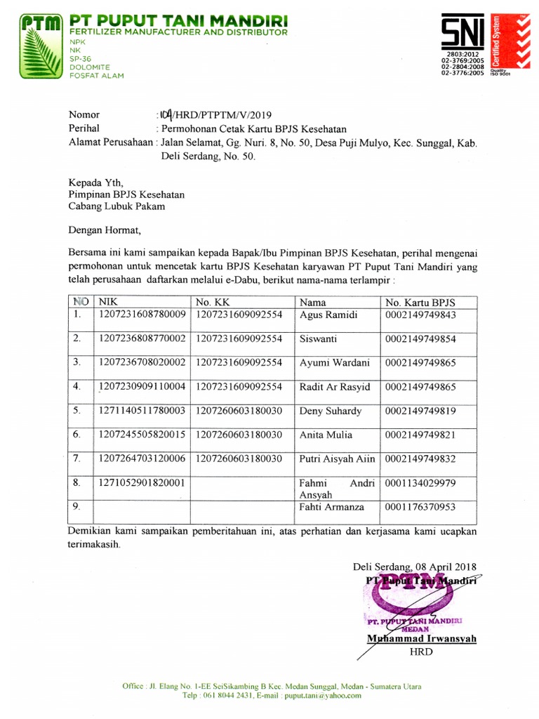 Akan tetapi dalam instansi ataupun perusahaan berkomunikasi dengan surat masih sangat. Hal ini dilakukan dengan memberikan pengertian pada perusahaan bahwa proses keluar dari pekerjaan adalah dengan cara yang baik dalam artian tidak dipecat sehingga berhak mendapatkan surat keterangan kerja untuk mengurus bpjstk dan lain. Dengan smartphone semua orang dapat berkomunikasi dengan cepat dan mudah apalagi semakin maraknya media social saat ini maka bisa dipastikan surat akan menjadi sejarah. Contoh surat pengantar dari perusahaan ke bpjs kesehatan setiap perusahaan yang memiliki karyawan wajib mendaftarkan karyawan karyawannya ke bpjs ketenagakerjaan dan kesehatan. Contoh surat pengantar dari perusahaan ke bpjs kesehatan setiap perusahaan yang memiliki karyawan wajib mendaftarkan karyawan karyawannya ke bpjs ketenagakerjaan dan kesehatan.