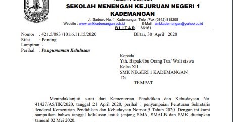 Berdasarkan peraturan sekretaris jenderal kementerian pendidikan dan kebudayaan kemdikbud nomor 5 tahun 2020 dinyatakan bahwa kelulusan sd sdlb program paket a atau sederajat ditetapkan tanggal 15 juni 2020. Surat pengumuman ini biasanya akan kita temui di lembaga pendidikan perusahaan instansi pemerintahan maupun organisasi. 2 kelulusan peserta didik sebagaimana dimaksud pada ayat 1 ditetapkan oleh satuanprogram pendidikan yang bersangkutan. Undangan pengumuman kelulusan ujian nasional harus diberikan paling lambat 1 hari sebelum pelaksanaan pengumuman. Ujian nasional sdmi tahun 2017 akan dilaksanakan pada bulan mei 2017 yaitu tanggal 15 16 dan 17 mei 2017 untuk ujian utama. Apapun itu namanya surat ini bertujuan untuk memberitahu peserta ujian mengenai hasil ujian yang telah dilaksanakannya apakah itu lulus atau tidak lulus.