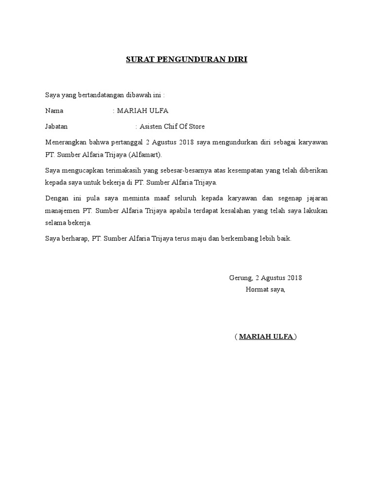 8473 3724 jabatan. Contoh surat pengunduran diri surat resign atau pengunduran diri dibuat untuk menyatakan keinginan memutuskan hubungan kerja dengan instansi atau perusahaan. Fungsinya adalah untuk melegalkan status tanggung jawab di perusahaan dan persyaratan administratif. Lsm anak muda peduli. Sumber alfaria trijaya di tempat. Berikut ini adalah surat pengunduran diri dari alfamart dan indomaret jika anda sedang mencari contoh surat pengunduran diri silahkan copy dan diedit saja surat pengunduran diri ini sesuai keperluan anda.