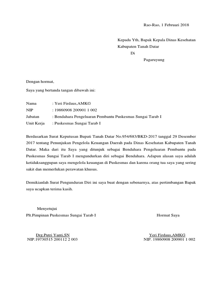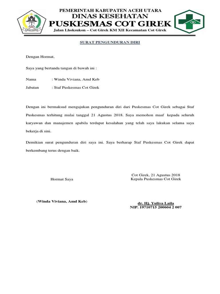 Contoh surat pengunduran diri dari puskesmas. Dengan segala resiko dan tanggungjawabnya mungkin saja anda merasa kurang cocok bekerja di rumah sakit. Contoh surat pengunduran diri atau contoh surat resign yang baik dan benar. Walaupun ada yang memiliki usaha namun jumlahnya tidak sebanding dengan para pekerja yang berpenghasilan dari gaji. Admin blog dapatkan contoh 2019 juga mengumpulkan gambar gambar lainnya terkait contoh surat pengunduran diri kerja di puskesmas dibawah ini. Kalau demikian maka tidak ada salahnya untuk resign kerja dari rumah sakit. Atau anda justru ingin keluar untuk melanjutkan pendidikan.