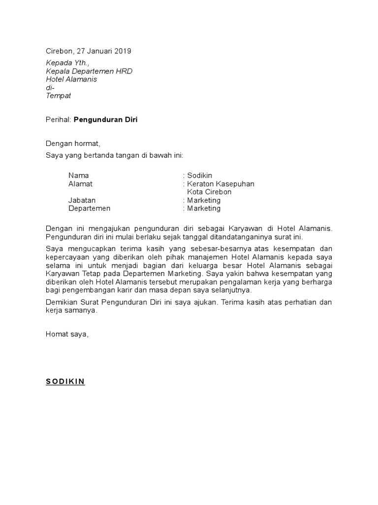 Contoh surat pengunduran diri dr hotel contoh surat pengunduran diri karyawan kontrak pabrik. Contoh surat pengunduran diri adalah jenis surat yang banyak diperlukan saat ini baik di kantor ia bekerja maupun di sekolah sekolah juga organisasi tempat dia berkecimpung selama ini biasanya surat ini dibuat ketika akan mengembangkan kemampuan dan ilmunya di tempat lain atau juga bisa jadi karena sudah tidak cocok dengan tempatnya yang sekarang dan ingin mencari suasana baru.
