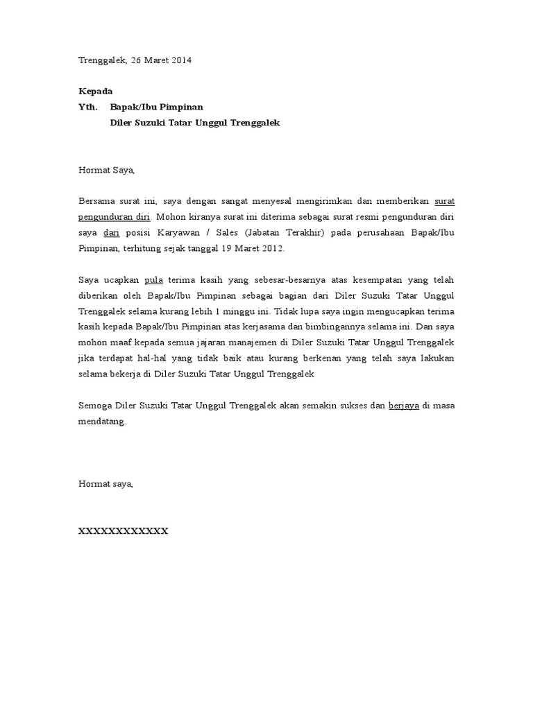 Bumi maya 21 november 2012 kepada yth ketua kpn blogernas di tempat dengan hormat saya yang bertanda tangan dibawah ini. Bila anda ingin mendownload contoh surat pengunduran diri dengan format doc silahkan klik link berikut ini. Contoh surat pengunduran diri berikut ini 3 contoh surat untuk pengunduran diri karyawan perusahaan dalam format sederhana tapi bisa digunakan secara resmi. Contoh surat pengunduran diri atau contoh surat resign yang baik dan benar. Contoh surat contoh surat lamaran yang baik 2016. Memang tidak ada bentuk baku surat pengunduran diri tapi secara garis besar surat tersebut berisi alasan pengunduran diri dan ucapan terima kasih atas kesempatan yang sudah diberikan oleh perusahaan.