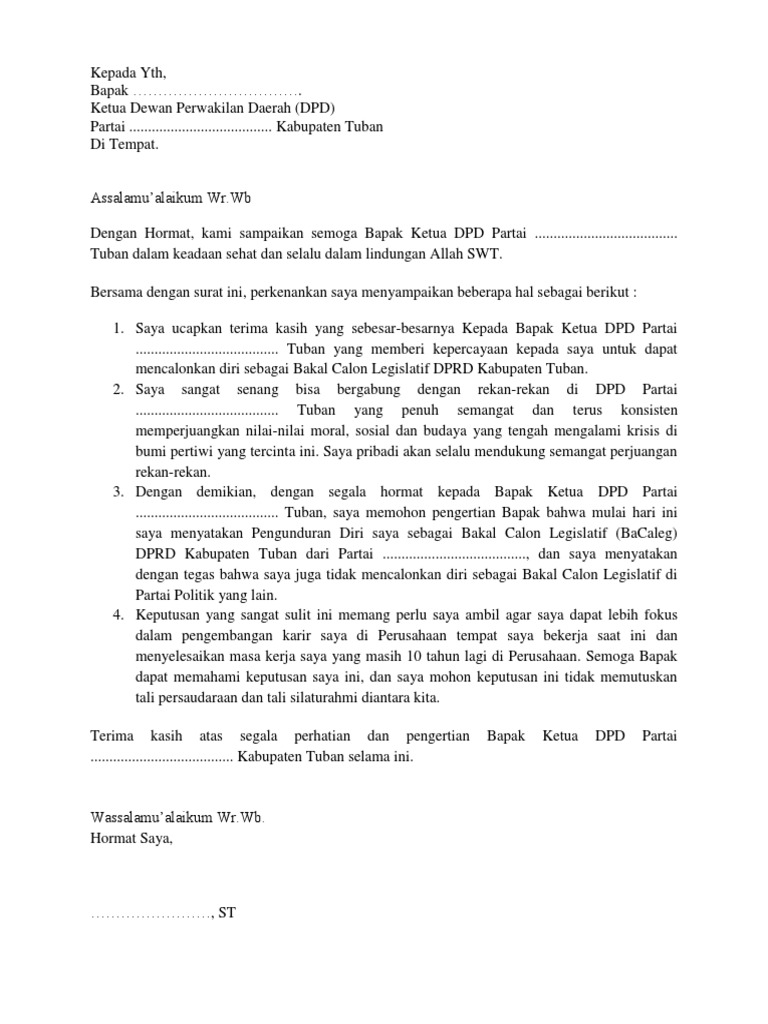 Contoh surat pengunduran diri sebagai caleg. Kepada yth kepala cabang jt express tangerang jl. Contoh surat pengunduran diri yang baik dan sopan tersebut cukup singkat dan pendek. Jika anda hendak mengundurkan diri sebagai caleg bakal caleg surat diatas mungkin bisa jadi contoh terbaik. Pluit selatan raya kav 1 14440 jakarta utara dengan hormat bersama surat ini saya indra bekti mengajukan permohonan mengundurkan diri sebagai karyawan dari pt. Kumpulan contoh surat bisnis surat dinas surat izin surat kuasa surat lamaran kerja surat pemberitahuan surat penawaran surat pengunduran diri surat. Melalui surat ini saya akan menyampaikan maksud dari pengunduran diri saya sebagai kepala humas di lsm anak muda peduli makassar karena harus melanjutkan kuliah di luar negeri terhitung mulai tanggal 30 juni 2018.