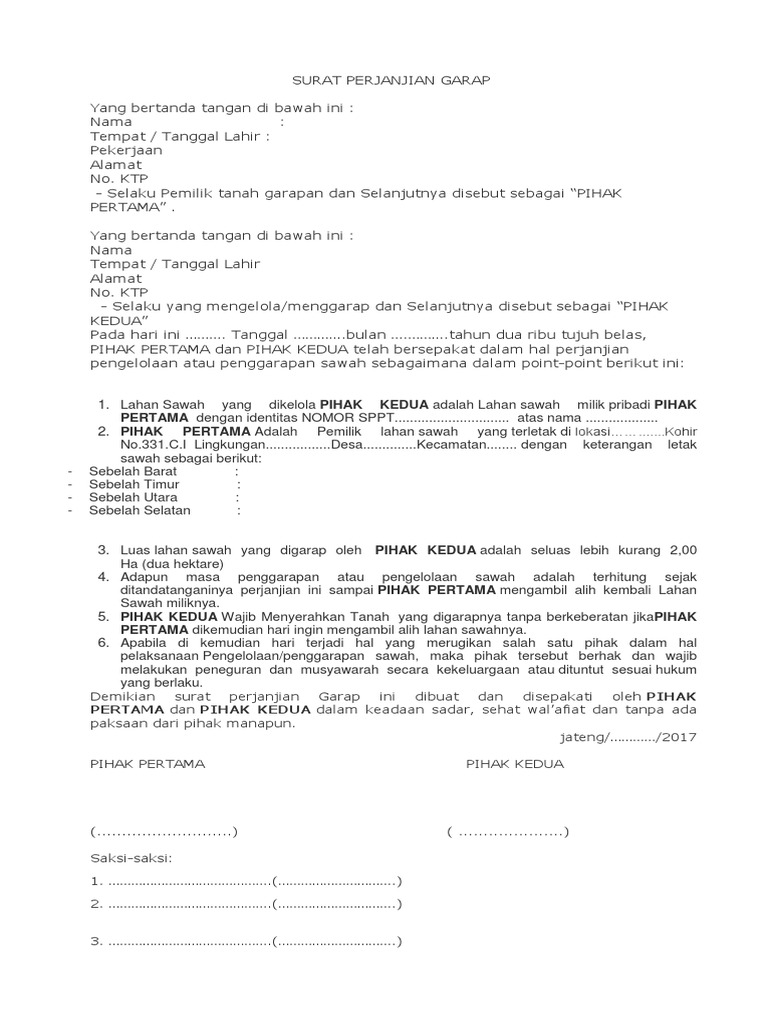 Demikian contoh surat oper alih tanah garapan ini dibuat semoga bisa menjadi referensi yang baik bagi anda yang membutuhkan. Kumpulan contoh surat lamaran kerja contoh surat perjanjian garap tanah surat dinas resmi contoh surat perjanjian garap tanah surat izin pernyataan. Contoh surat perjanjian garap tanah. Pada artikel sebelumnya kita telah membahas mengenai surat perjanjian jual beli rumah sederhanapada artikel contoh surat perjanjian jual beli tanah terbaru kali ini kita akan membahas mengenai topik yang hampir sama. Mohon maaf apabila terdapat kesamaan namatempatinformasi lain karena surat yang dibuat hanya bertujuan sebagai percontohan tanpa ada maksud apapun. Saat ini apakah anda berniat untuk menggadaikan sebagian atau keseluruhan tanah yang anda miliki untuk berbagai keperluan.