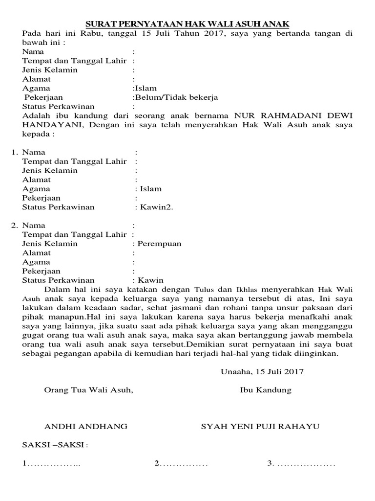 Tempat tgl lahir. Surat ini digunakan sebagai tanda bukti mengenai hak asuh anak sehingga tidak bisa digugat di kemudian hari.