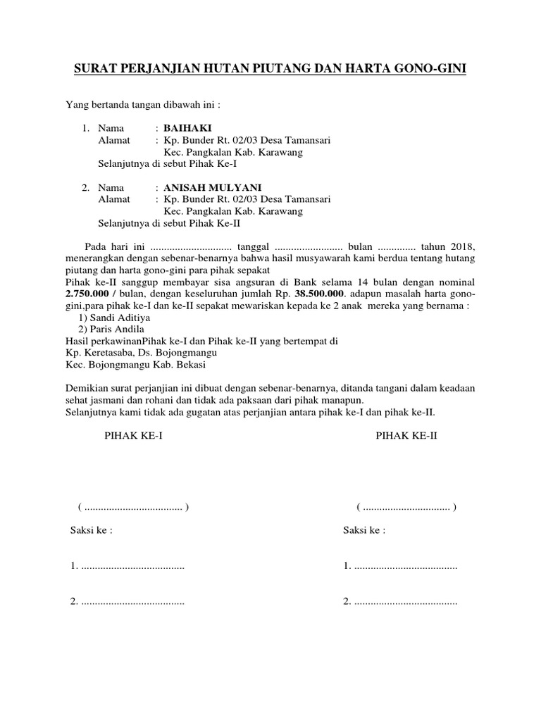 Contoh surat perjanjian harta gono gini. Draf ini di dalamnya mengatur tentang pembagian hak dan kewajiban suami istri dalam pembagian harta bersama perkawinan sebagai pelaksanaan dari putusan pengadilan agama bagi suami istri yang beragama islam. Admin blog kumpulan surat penting juga mengumpulkan gambar gambar lainnya terkait contoh surat perjanjian pembagian harta gono gini dibawah ini. Contoh surat pernyataan harta gono gini have a graphic associated with the othercontoh surat pernyataan harta gono gini it also will feature a picture of a sort that may be observed in the gallery of contoh surat pernyataan harta gono gini. Contoh gugatan harta gono gini lengkap dalam perceraian lorong pabrik. Kali ini saya akan berbagi contoh surat perjanjian pembagian harta bersama atau gono gini. Contoh surat hukum ketenagakerjaan hukum perkawinan hukum pertanahan hukum acara senin 29 september 2014 contoh perjanjian pembagian harta bersama gono gini.