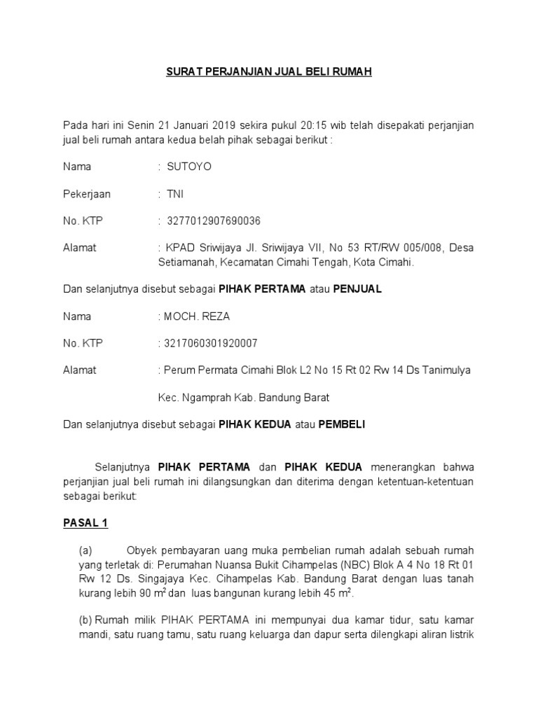 Perbedaannya adalah bahwa surat ini hanya bersifat pengikat atau surat awal yang digunakan untuk mengikat antara penjual dan pembeli. 15 contoh surat perjanjian yang baik dan benar paling lengkap ketika dua orang atau dua pihak melakukan sebuah kesepakatan maka perlu adanya surat perjanjian yang jelas mengenai kesepakatan yang dibuat tersebut. Contoh surat perjanjian pengikatan jual beli rumah sppjb ini diperlukan ketika terjadi transaksi jual beli antara 2 pihakapa bedanya dengan surat jual beli biasa. Surat ini bersifat penting karena saat kita telah membeli sesuatu menjadi sebuah bukti yang sah di mata hukum barang tersebut status kepemilikannya pindah ke pihak kita sebagai pembeli.