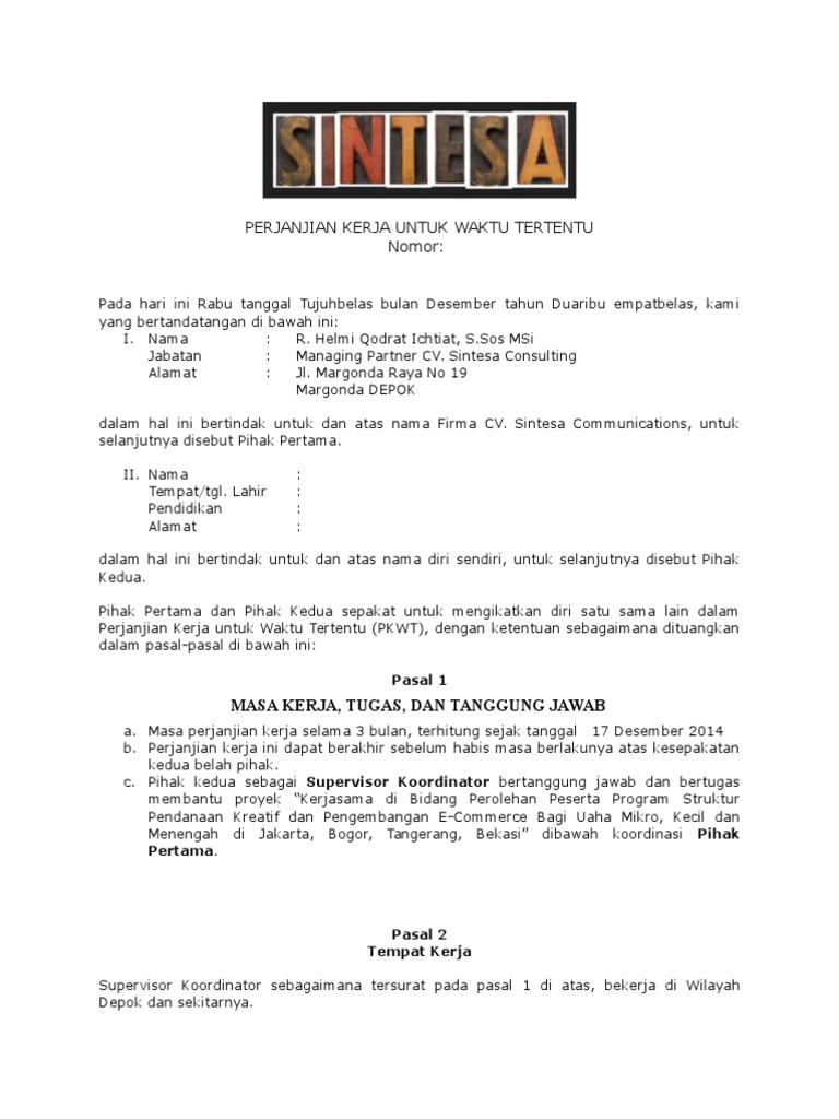 Perjanjian kerja untuk waktu tertentu pkwt yang pekerjanya sering disebut karyawan kontrak dibuat berdasarkan jangka waktu tertentu atau berdasarkan selesainya pekerjaan tertentu. 414 rawalumbu bekasi jabatan. Draf perjanjian kerja pkwtt ini berisi ketentuan yang mengatur tentang hubungan kerja antara perusahaan dan karyawan. Share on twitter facebook whatsapp pinterest. Contoh surat perjanjian waktu tidak tertentu perjanjian kerja untuk waktu tertentu pkwt yang pekerjanya sering disebut karyawan kontrak dibuat 3 weeks ago recent posts. Pada hari senin tanggal 2 bulan januari tahun 2015 telah dibuat dan disepakati perjanjian kerja antara.