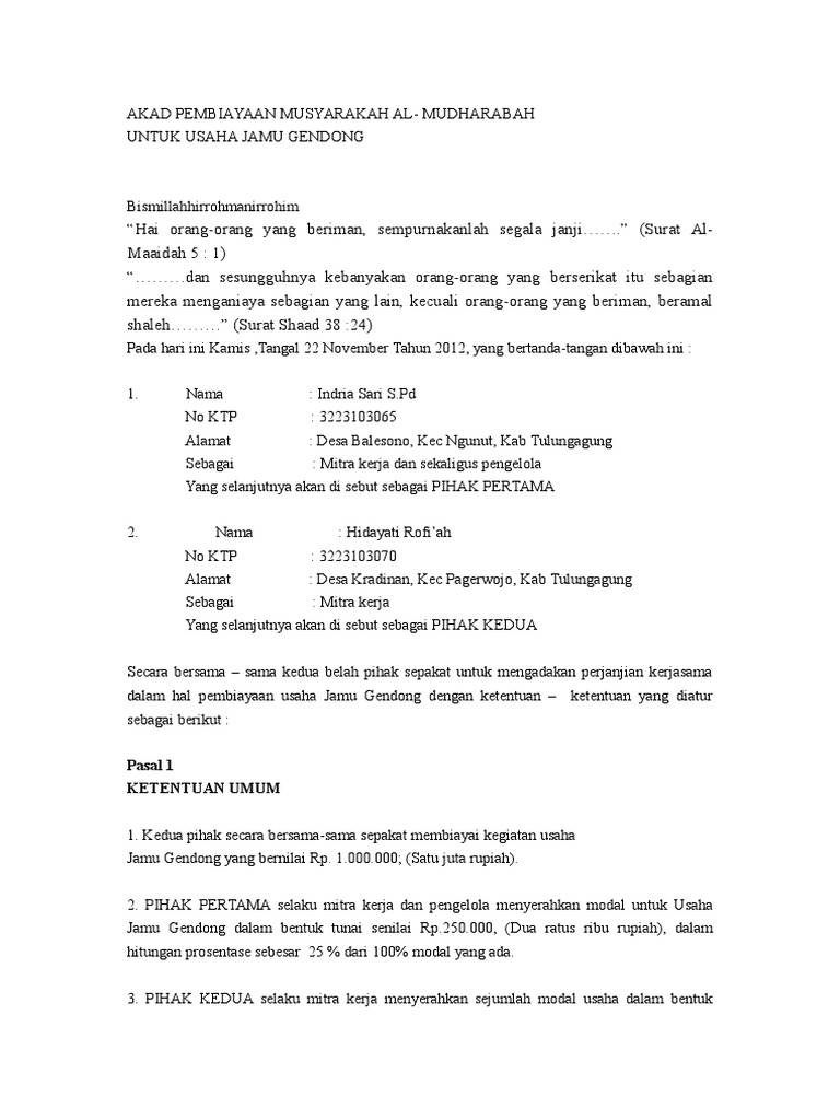 4 juta yaitu 50 x rp. Contoh akad mudharabah. Aku adalah pihak ketiga yang maha melindungi bagi dua orang yang melakukan syarikahper janjian selama salah seorang di antara mereka tidak berkhianat kepada kawan syarikatnyaapab ila diantara mereka ada yang berkhianat maka aku akan keluar dari mereka. Surat perjanjian bismillahirrahmaanirrahiim surat aqad syarikat mudharabah mukadimah allah swt berfirman dalam hadits qudsi. Kedua belah pihak telah sepakat mengadakan perjanjian bagi hasil bersyarat mudharabah muqayyadah. Dokumen surat surat bukti kepemilikan atau hak lainnya atau barang barang yang di jadikan jaminan danatau pernyataan pengakuan sebagaimana tersebut pada pasal 9 perjanjian ini ternyata palsu atau tidak benar isinya danatau nasabah melakukan per buatan yang melanggar atau bertentangan dengan salah satu hal yang ditentukan dalam pasal 8 danatau pasal 11 perjanjian ini.