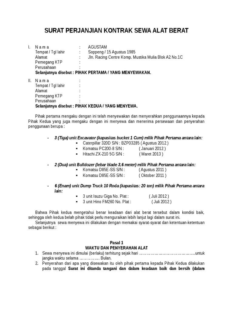 Surat perjanjian sewa pakai alat berat nomor. Contoh surat perjanjian sewa tanah detiklife. Contoh surat penawaran alat berat excavator have a graphic associated with the othercontoh surat penawaran alat berat excavator in addition it will feature a picture of a sort that could be observed in the gallery of contoh surat penawaran alat berat excavator. Menurut kbbi sewa berarti pemakaian sesuatu dengan membayar uang sedangkan menyewa berarti memakai meminjam menampung dengan membayar uang sewa sewa menyewa adalah persetujuan antara pihak yang. Jika diperlukan anda juga bisa mendownload surat perjanjian doc format word dalam ukuran a4 dan f4 atau folio. Perjanjian ini akan berakhir dengan sendiri setelah pihak kedua menyatakan tidak lagi memperpanjang sewa alat berat yang disewakan.