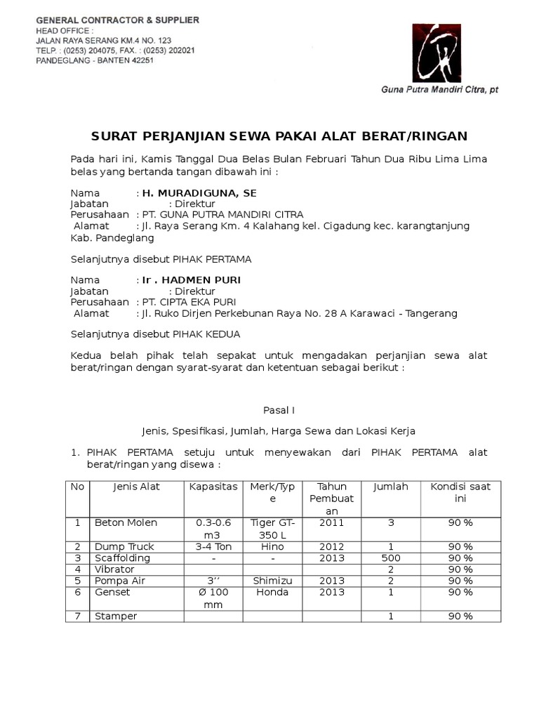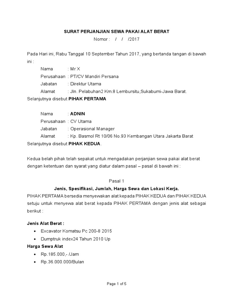 Contoh surat perjanjian sewa alat berat. Untuk menunjang pekerjaan sebuah perusahaan kontraktor maka perlu adanya alat pendukung berupa alat berat dalam penggunaan alat berat untuk menghindari terjadinya perseleisian makan sewa alat diatur dalam sebuah kontrak. Contoh surat perjanjian sewa pakai alat berat surat perjanjian sewa pakai alat berat. Semoga dapat membantu dan tolong bantuannya juga untuk mensupport kami dalam memasukkan contoh surat dengan cara klik iklan didalam blog ini terimakasih. February 21 2018 at 302 am. Contoh perjanjian sewa menyewa baik itu perjanjian sewa rumah sewa mobil sewa alat berat maupun perjanjian sewa menyewa barang lain. 064bsisab 2015 pada hari ini rabu tanggal 17 juni tahun 2015 yang bertanda tangan di bawah ini.