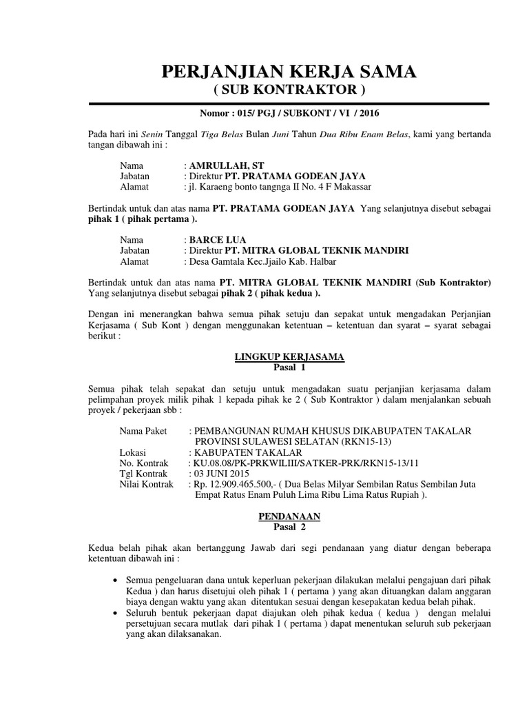 Contoh surat perjanjian sub kontraktor. Contoh surat penawaran kontraktor itu tadi adalah contoh surat penawaran barang yang dapat menjadi referensi bagi anda. Berikut ini contoh surat yang baik dan benar serta menarik perhatian yang dapat anda gunakan dalam tema maupun format penulisan surat. Demikianlah 2 contoh surat kontrak perjanjian pembangunanuntuk mendapatkan contoh lain bentuk surat perjanjian yang sesuai dengan kebutuhan anda silahkan lihat kumpulan contoh surat perjanjian kami yang lain dalam kategori surat perjanjian. Perjanjian ini diperbuat pada 23 september 2013 di antara abdul halim bin yahya yang beralamat di batu 2 kg. Melalui kontrak terciptalah perikatan atau hubungan hukum yang menimbulkan hak dan kewajiban pada masing masing pihak yang membuat kontrak. Surat perjanjian kerjasama ini telah dibaca dimengerti dan disetujui oleh kedua belah pihak pada hari ini dan tanggal tersebut pada surat perjanjian kerjasama ini dibuat sebanyak rangkap 2 dua dan dibubuhi tanda tangan sebagai tanda kesepakatan bersama tanpa ada tekanan dan unsur paksaan dari pihak manapun dan mempunyai kekuatan hukum yang sama.
