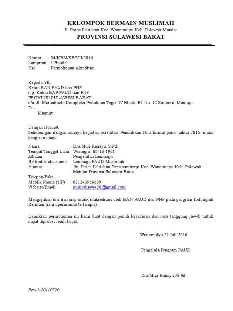 Contoh format surat permohonan pengajuan akreditasi paud dan pnf serta bagaimana cara upload surat permohonan akreditasi ban paud pnf. Contoh format surat permohonan akreditasi sekolah paudtk dikmas ban pnf. Ukuran kertas yang digunakan. Persyaratan surat permohonan akreditasi paud. Surat permohonan izin pendirian sekolah paud tk ra kober pendidikan anak sejak usia dini merupakan salah satu kunci mengatasi keterpurukan bangsa khususnya dalam menyiapkan sumberdaya manusia yang handal nantinya dan juga pendidikan yang sangat menentukan bagi tumbuh kembangnya anak didik di kemudian harianak merupakan aset keluarga masyarakat dan bangsa sehinga harus mendapat pembinaan. Download contoh surat keterangan pindah sekolah paud tk kb tpa sps format doc yang dapat di edit.