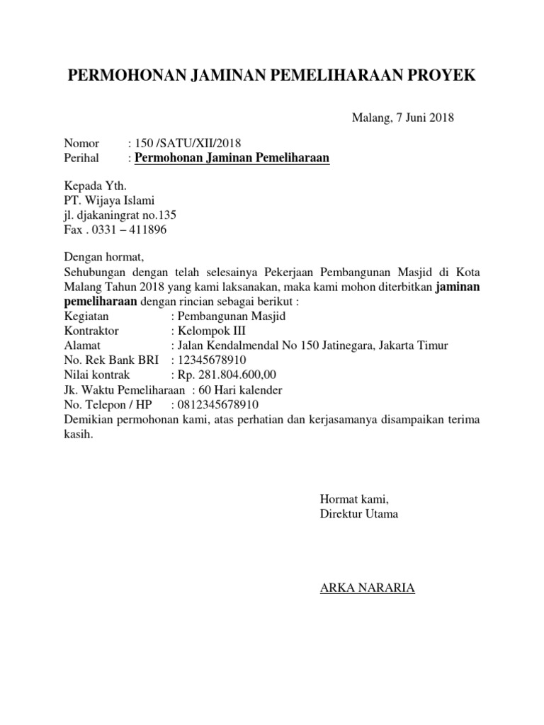 Nilai jaminan pemeliharaan 5 dari kontrak misalkan 5 x rp. Mohon maaf apabila terdapat kesamaan nama tempat atau informasi di dalam surat karena surat yang dibuat hanya untuk percontohan saja tanpa ada maksud apapun. Berikut ini adalah salah satu contoh s urat pernyataan jaminan keaslian dan garansi yang sederhana. Home contoh jaminan surat contoh surat permohonan jaminan pemeliharaan contoh surat permohonan jaminan pemeliharaan by khairul amna 031300 no comments. Contoh surat lengkap surat ijin surat lamaran kerja perintah resmi permohonan keterangan undangan dinas niaga jalan dukungan pengantar. Berikut ini adalah contoh jaminan pemeliharaan maintenance bond jaminan pemeliharaan nobond.
